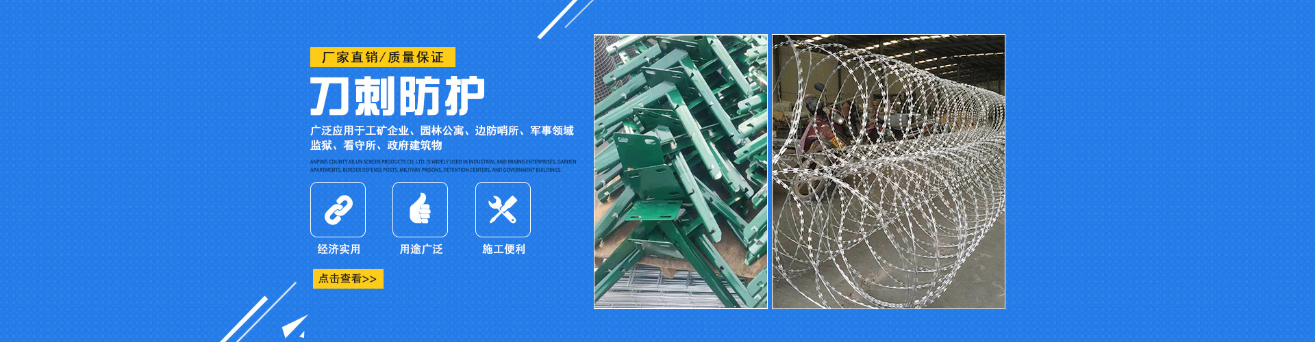 刀片刺繩?是一種新型防護(hù)網(wǎng)產(chǎn)品,具有生產(chǎn)工藝復(fù)雜、防護(hù)效果好、施工方便等優(yōu)點(diǎn)。如果你想知道,請看以下內(nèi)容。